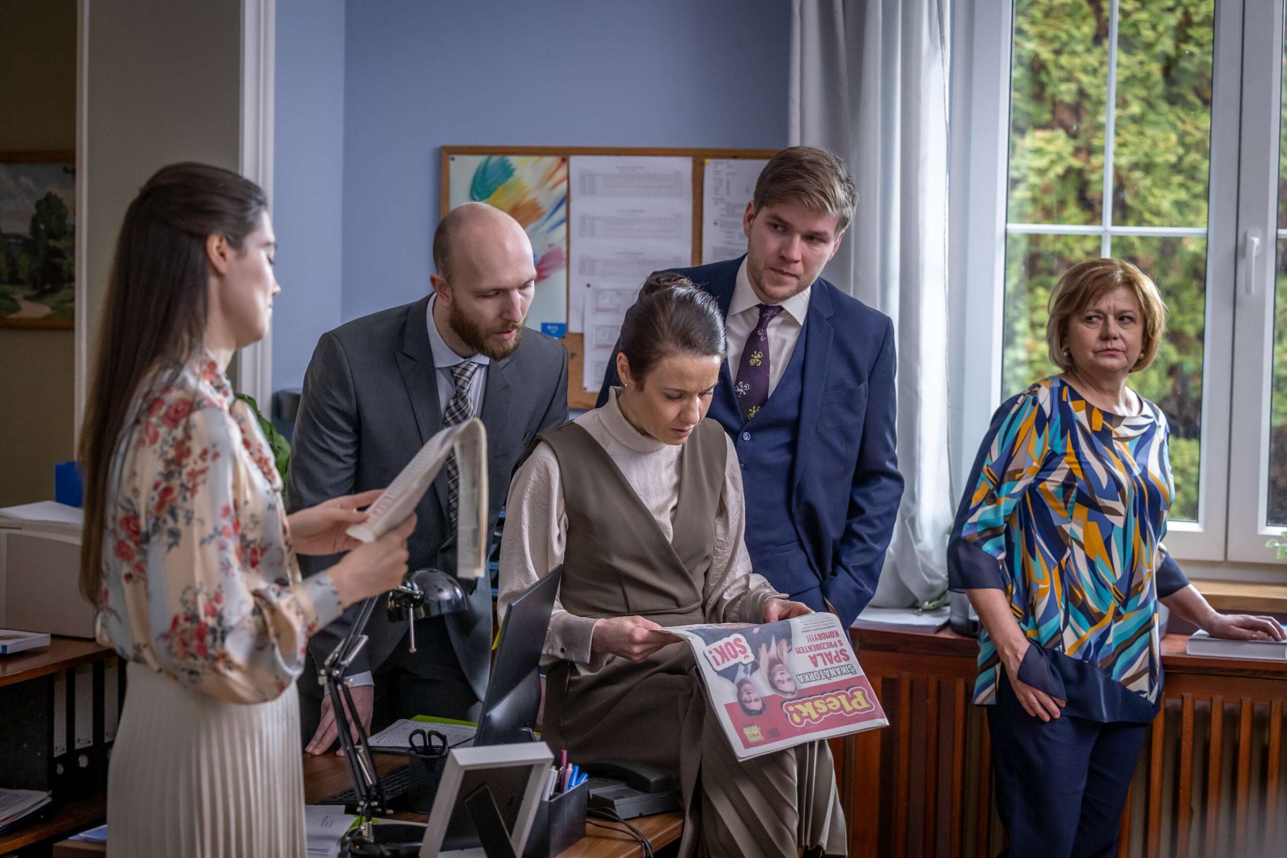 Noviny v ruce má i Pavlína Strouhová (Zuzana Páleníková), ale jen Vlasta Hanušková (Ivana Andrlová) jaksi postává u okna a tváří se, že by tam raději ani nebyla a že je jí to snad i nepříjemné…